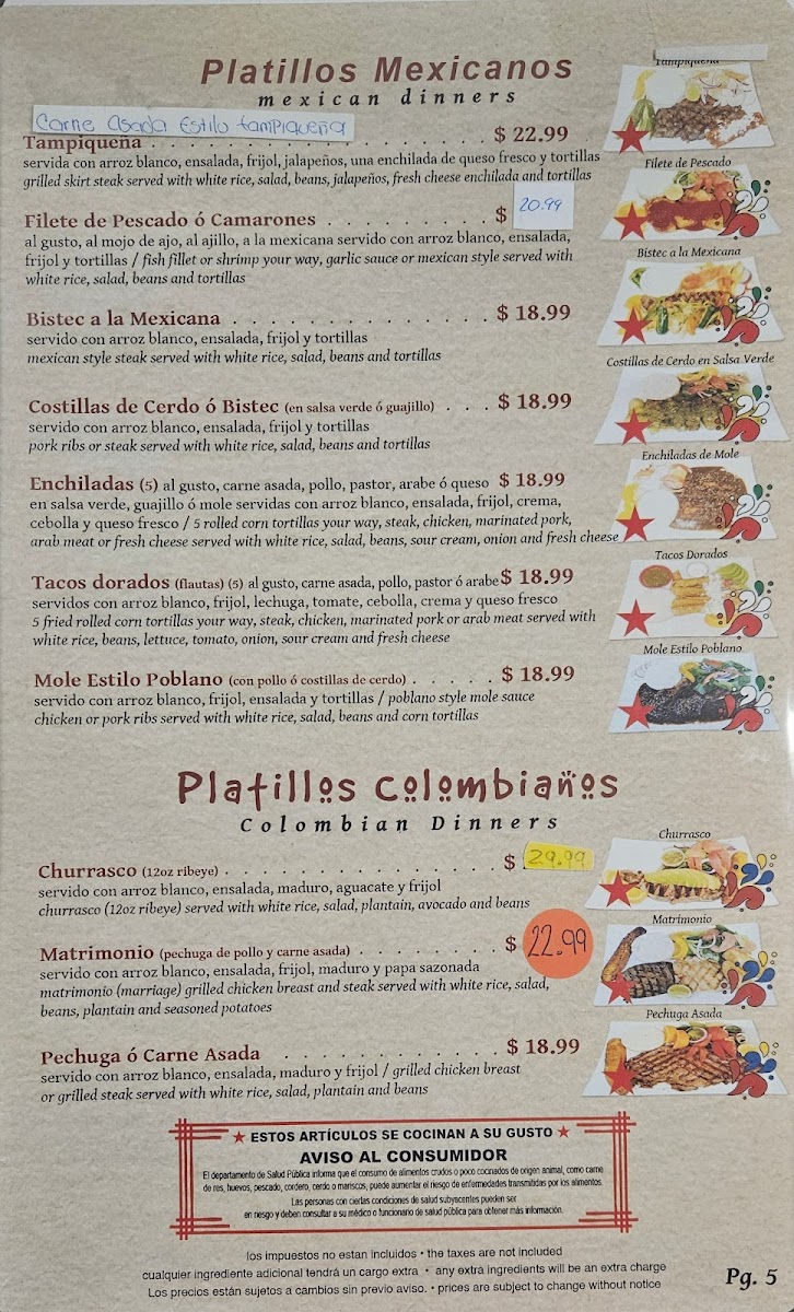 Highlights include Colombian staples such as the Paisa Platter or the tender Empanadas De Carne, alongside Mexican favorites like Mole Enchiladas and Tacos Dorados. These dishes carry a warm, homey vibe that complements the relaxed atmosphere of the restaurant, making it a fitting place to gather over thoughtfully prepared meals.
